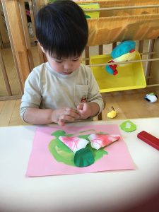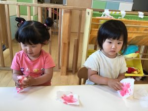 出来上がった作品を見て「いちごおいしそう🍓」「これ⚪︎⚪︎ちゃんのいちごだよ♪」など