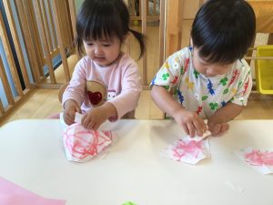 コーヒーフィルターに水性のマジックで色をつけた後にお水を塗って色が滲んでいく様子をじっくり観察していたりんご組さん。