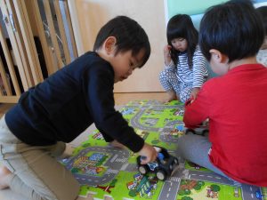 みんなで車で遊んでいます♡ 道路の絵のマットを敷きその上を走らせます。