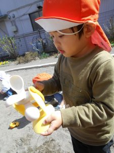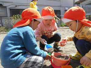 「何が出てくるのかな?」とお友だちと一緒になって砂を掘ったり