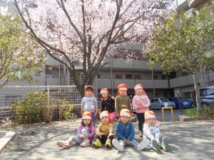 公園の桜が咲き始めていたので、みんなで記念写真を撮りました。