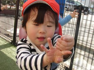 園庭に出て遊ぶときは全力で走るいちご組さんに混ざって「私も~!」と言いながら声を出しながら走り待っています。