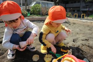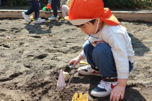 公園遊びでは大好きな乗り物を走らせて遊んだり、砂で形をとって