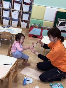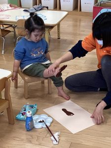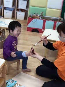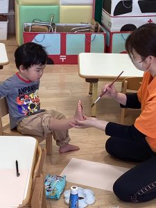 こちらは3月の製作『さくら』の木の部分の足形をとっている様子です👣