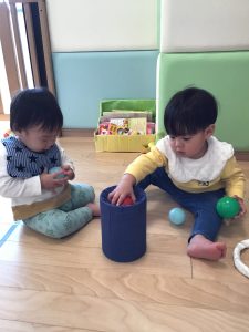 お部屋では低月齢児の子も、同じおもちゃで一緒に遊ぶ姿が見られるようになりました。