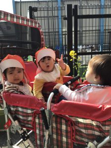 ポカポカ陽気の中、園庭遊びに行く途中プランターの菜の花、