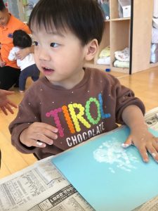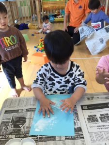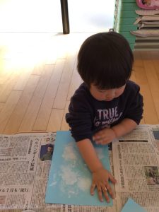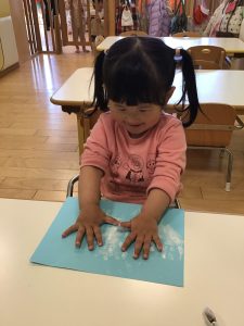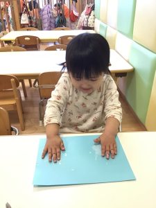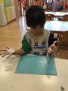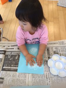 白い絵の具を両手に付けて青い画用紙にペタペタ🎨