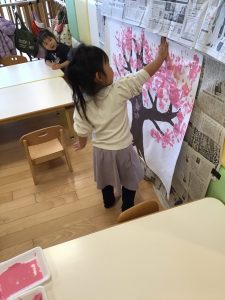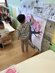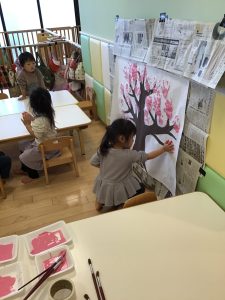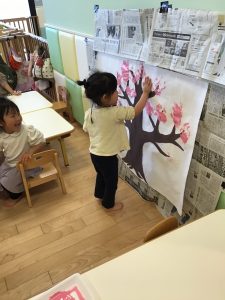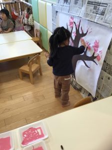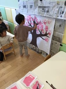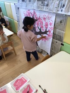 たっぷりピンクの絵の具を付けた手で、木にペッタンペッタンと手形を押していきました☺️