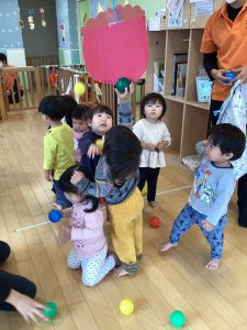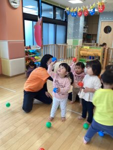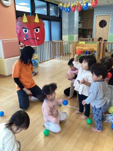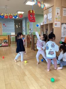 豆に見立てたボールを上手にぶつけて、『おには〜そと!ふくは〜うち!』