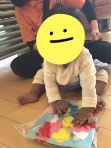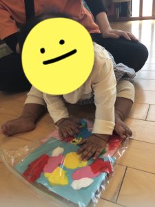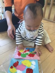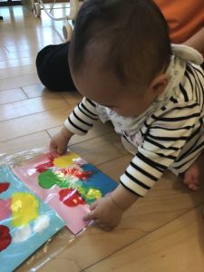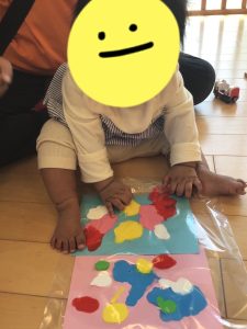 絵の具のグニュっとした独特な感触が面白いようで、夢中で触ったり叩いたりしていたもも組さんです🎨