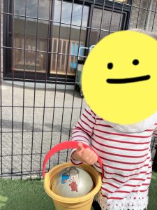 途中で落ちていたボールを拾って、バケツに入れてみました🤭