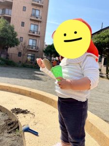 園庭にはバケツもあって、まるで買い物カゴかのように腕に通して持ち歩き、、