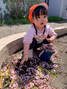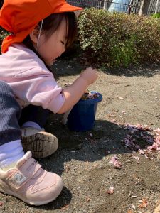 また、春ならではの桜の花びらを集めてバケツいっぱいに入れた砂の上にのせて飾りをつけたり、