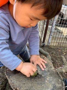 切り株の穴の中に入れてみたり、時に大きさに合わずに入らないと『おっきい』と言いながら