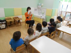 今週の読み聞かせプログラムはりんご組さんの様子です。