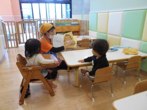 本日は0歳児もも組さんの読み聞かせの様子をお伝えしますね。