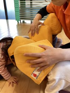 防災頭巾の上に座ってみたり、どんな風にかぶるのか試行錯誤している子など