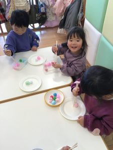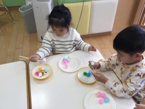 「お家でも使っているよ」と言うお友達が多く、やり方を見ると頑張ってつまんでいて、全部移し替えると「もう一回する」と言っては繰り返し楽しんでいましたよ☺️