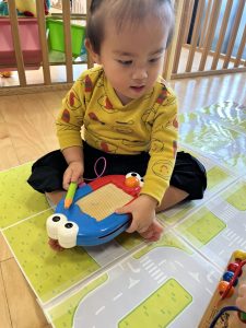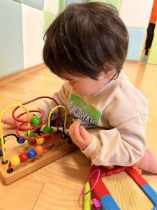 たくさん身体を動かして遊んだ後は、紐通しやルーピングなど自分の好きなおもちゃを選んで遊びました☺️