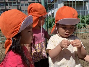 りんご組さんはお散歩中にお花を見つけてタネを剥き、