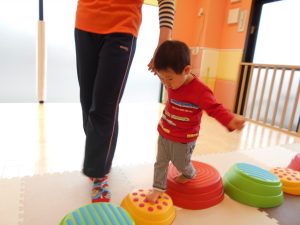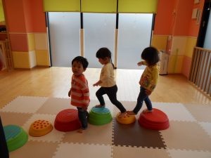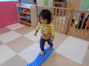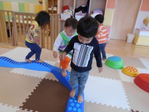 波型の平均台で身体を動かして遊びました。りんご組さんは前より落ちずに渡れるようになり、成長した姿が