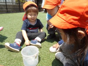 園庭で見つけたカエルを何日にもわたって観察していた子ども達