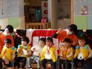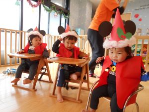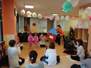 ジングルベルの歌に合わせて鈴を鳴らしました。おうちの人の顔をみて泣いてしまう子もいたので