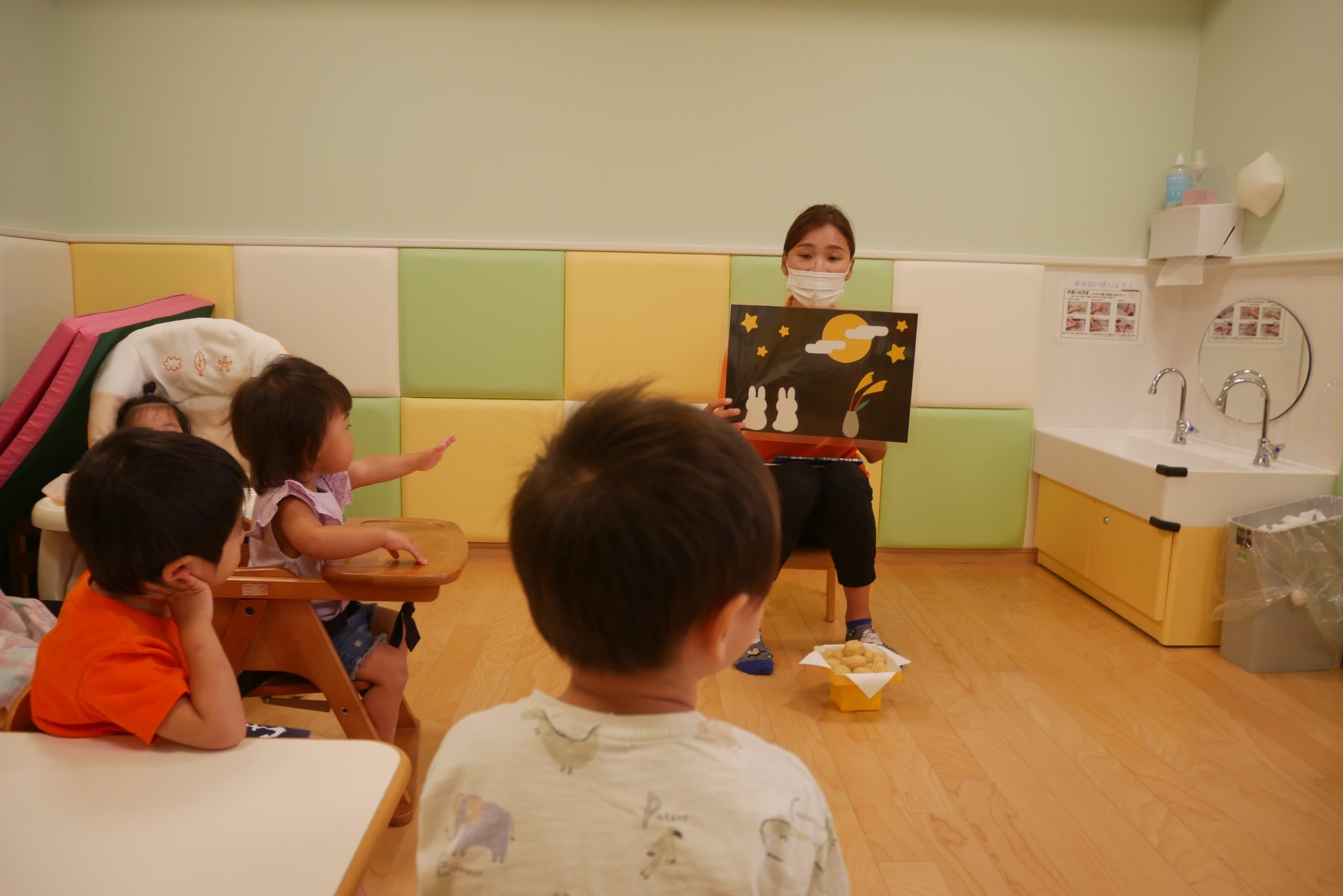 次にお月見の絵本を読んでもらっていました。パパやママがお迎えに来てくれた後、みなさんで