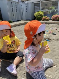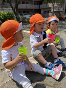 暑い日が続き、公園遊びや園庭遊びなどの戸外遊びではお茶休憩を始めました(^^)