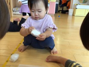 ボールを擦り合わせてキュッキュッと不思議な音を「お?」と楽しむ子や
