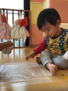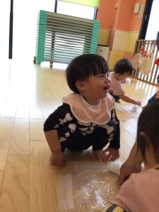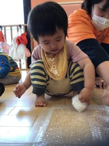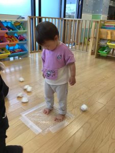 プチプチを使ってボールを作ってみたり、床に敷いてプチプチの感触を楽しんで遊びました!!