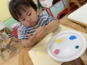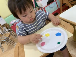 絵の具を準備して画用紙を渡すと嬉しそうにまずは絵の具を少し指にちょんと👆🏻💦