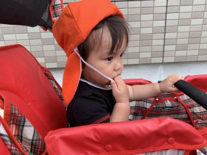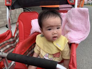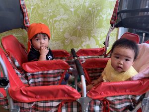 バギーにお友だちと一緒に座って戸外活動を楽しみながら