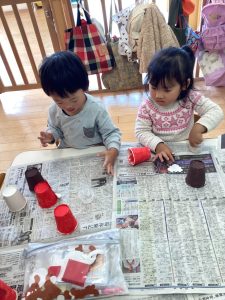 絵の具が乾くと、紙コップにトナカイのツノや鼻、サンタクロースの帽子などを貼りました!