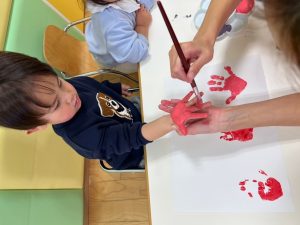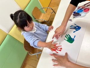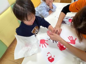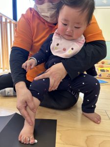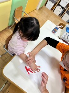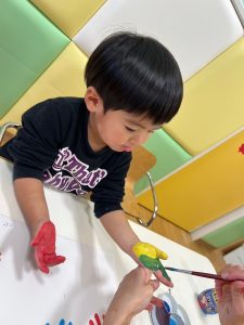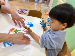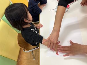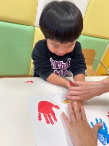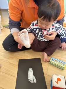 声をかけると自分の足をジッーと見て上手に画用紙にペッタンすることが出来ました