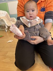 きて始めは泣いてしまうお友だちも「くすぐったいね〜」「冷たくて気持ちいいね〜」と