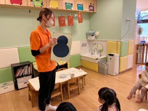 始めに保育士の話に耳を傾けて興味津々…!