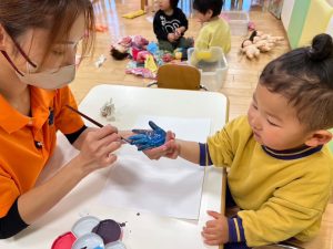 様々な色を用意し、『何色塗りたい?』と聞くとそれぞれ子どもたちが好きな色を選び、
