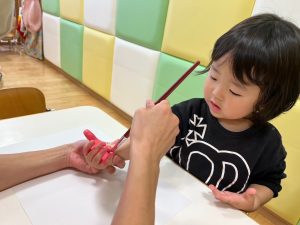 筆で手に色を塗るとくすぐったくて手を引こうとする児や