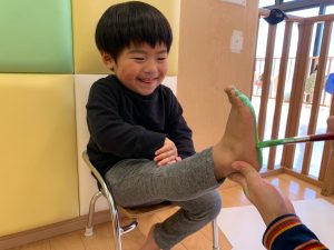 筆で足の裏をなぞられる感覚を楽しむ姿が見られ、成長を感じました☺️