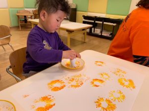 大きな画用紙いっぱいにスタンプをして楽しむ姿が見られ、