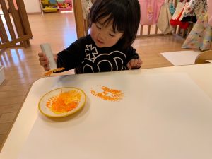 実際にやってみると黄色とオレンジ色の絵の具をたっぷり付けて