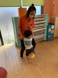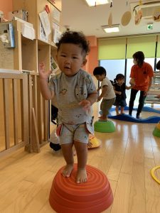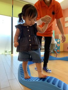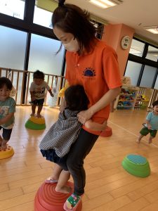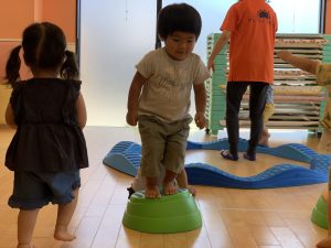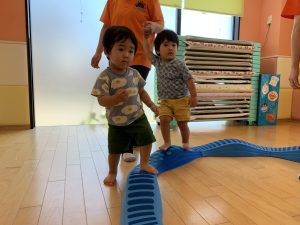 バランスが上手に取れずに怖いお友だちは保育士と手を繋いで一緒にやってみました👣