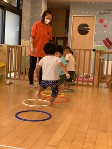 保育士がフラフープの穴を走りながら通り抜けるとそれを見ていたお友だちも