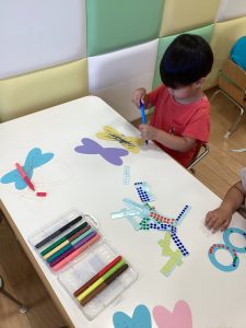 メガネの部分にはシールを貼って、羽の部分にはお絵描きをします✨