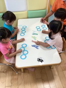 いろんな色のシールを使って、等間隔に並べたり色を交互にしたり、