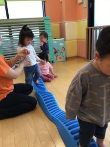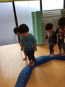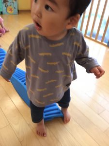 平均台では、保育士と手を繋いで、何度か落ちながらも嬉しそうに渡っていました