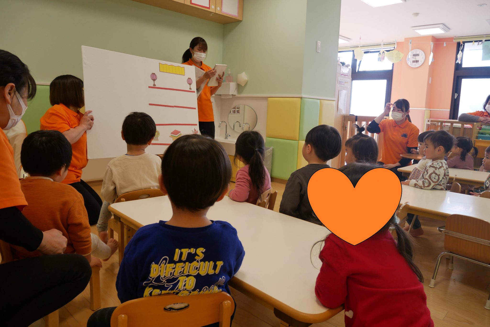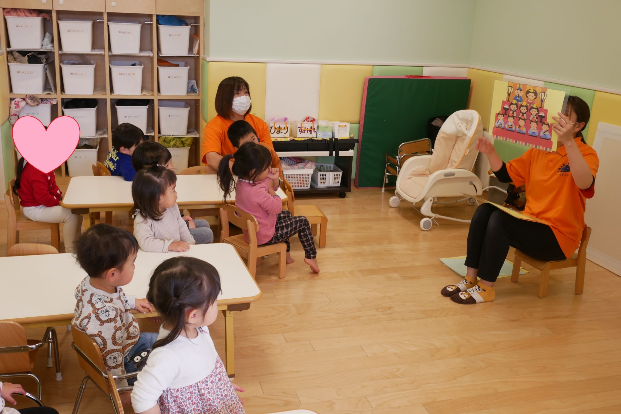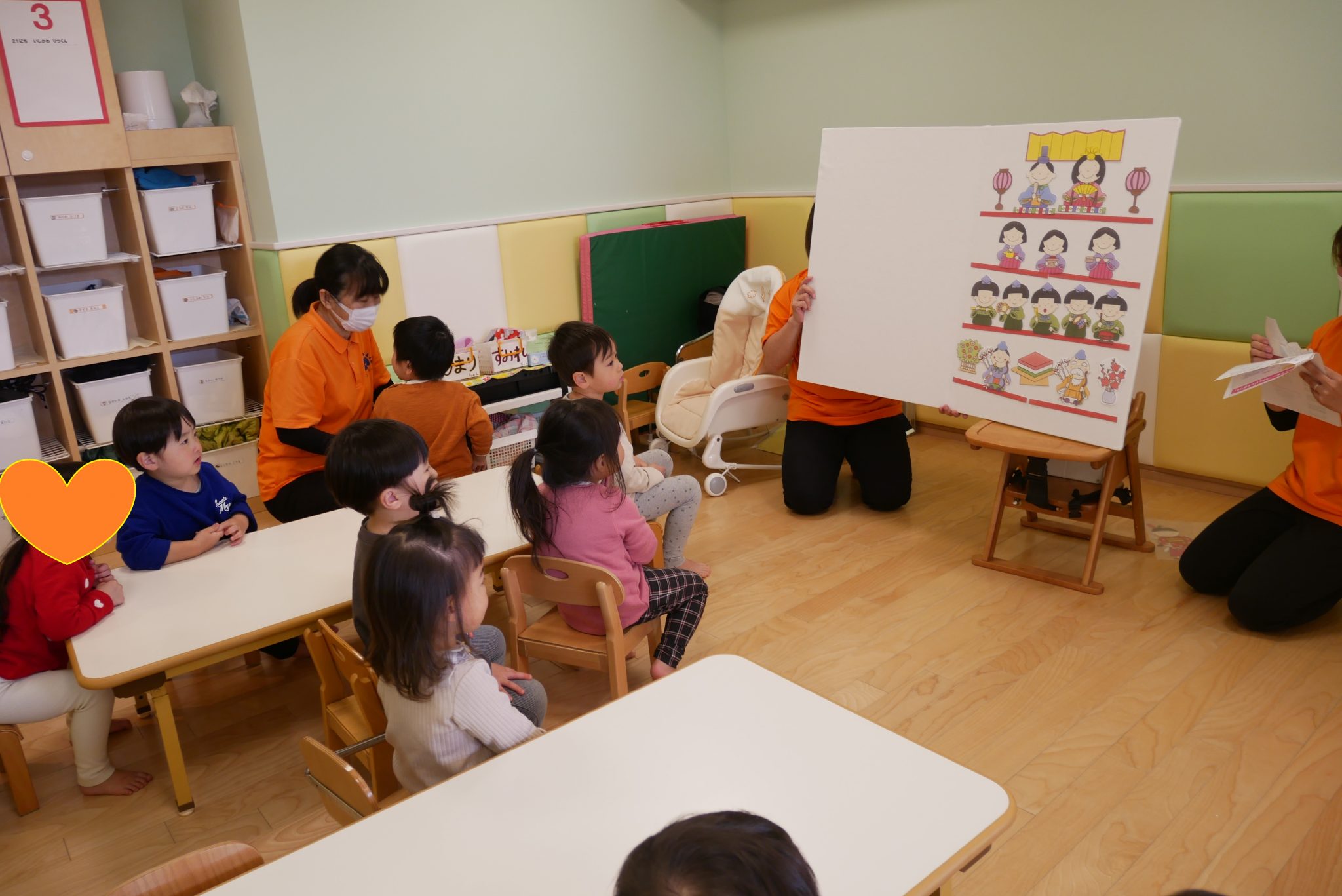 保育室内はみんなが作ったひな祭りの製作が飾られとても可愛らしい雰囲気でしたよ?