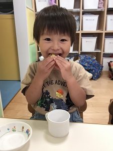 皮を剥いたトウモロコシは、調理さんにお願いし、午後のおやつに出してもらい、みんなで美味