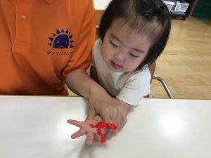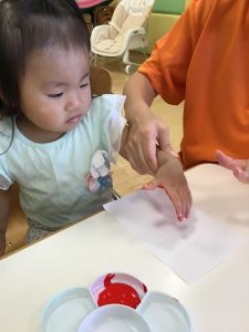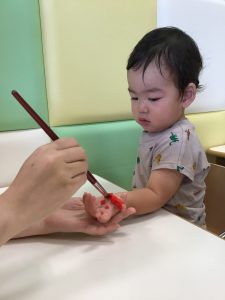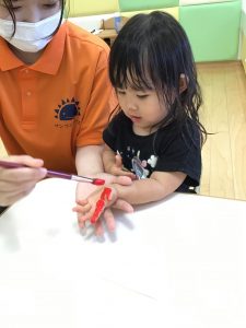 絵の具がつく感触が嫌だったのか、赤い絵の具が怖かったのか、泣いてしまう子もいましたが、